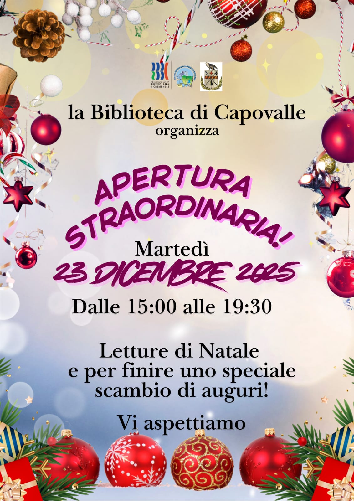 Si comunica che ci sarà un'apertura straordinaria della Biblioteca di Capovalle martedì 23 dicembre.